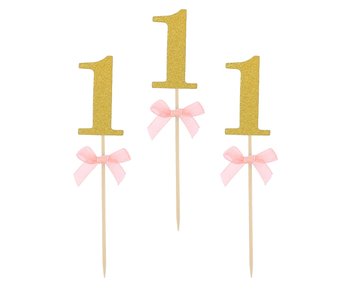 10 Toppers Cupcakes Número 1 Glitter Laço Rosa