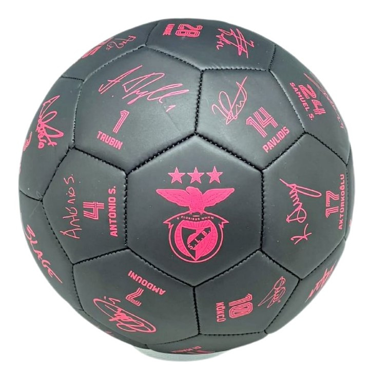 Bola de futebol do Sport Lisboa e Benfica, em preto com as assinaturas dos jogadores da temporada 2025/2026 para te divertires a jogar.
