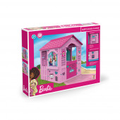 Uma casinha com 84 x 103 x 104 cm, quando montada, com as cores e os autocolantes da Barbie para decorá-la.