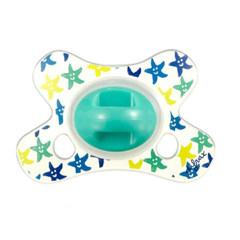 Esta chupeta bonita é fornecida com um escudo em forma de borboleta, garantindo um ajuste perfeito para o rosto do seu bebé. O recesso para o nariz permite que seu bebê respire livremente pelo nariz. Dois orifícios aéreos de cada lado proporcionam fluxo de ar adicional, evitando a irritação da pele. Este produto é chamado Dental, porque é desenvolvido em cooperação com uma equipe médica de dentistas pediátrico.