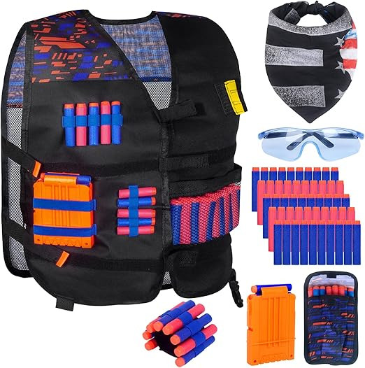 Conjunto de colete Nerf para adolescentes: o pacote inclui 1 colete nerf 50 dardos de espuma 1 rpacote Bullets Clip 1 pulseira 1oculos protetor 1 máscara tática 1 bolsa para dardos. Munição de alta qualidade para as suas armas Nerf.