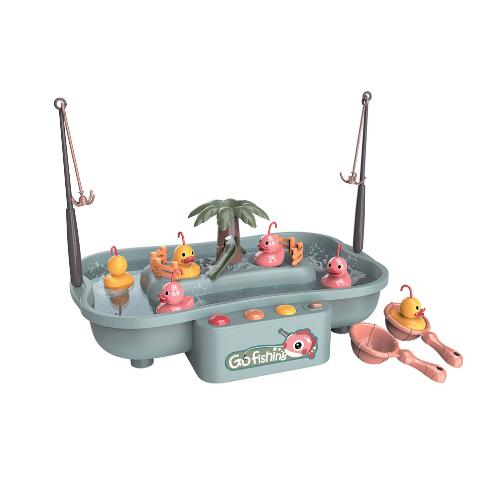 Inclui 21 peças: 2 canas de pesca, 1 tabuleiro / lago circuito, 6 patinhos em 2 cores sortidas, 2 conchas e acessórios decorativos.