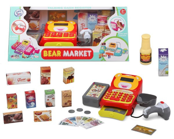 Com todos os elementos que necessitas para ires às compras, ou seres tu a dona da loja e que atendes os clientes.