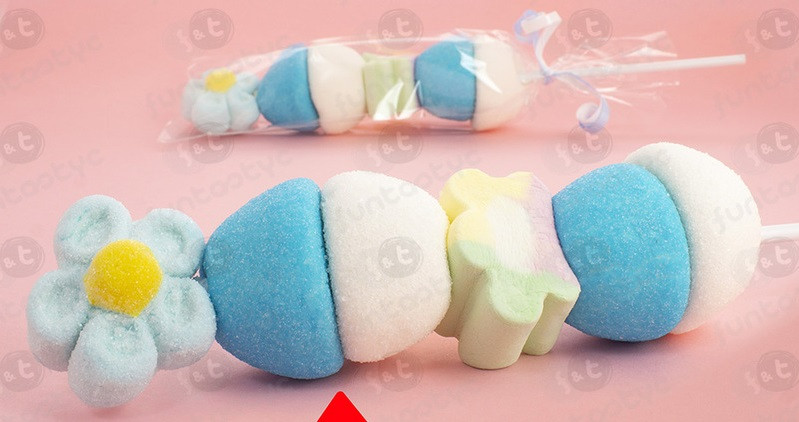 Está embrulhado com um saco transparente decorado com pontos brancos.