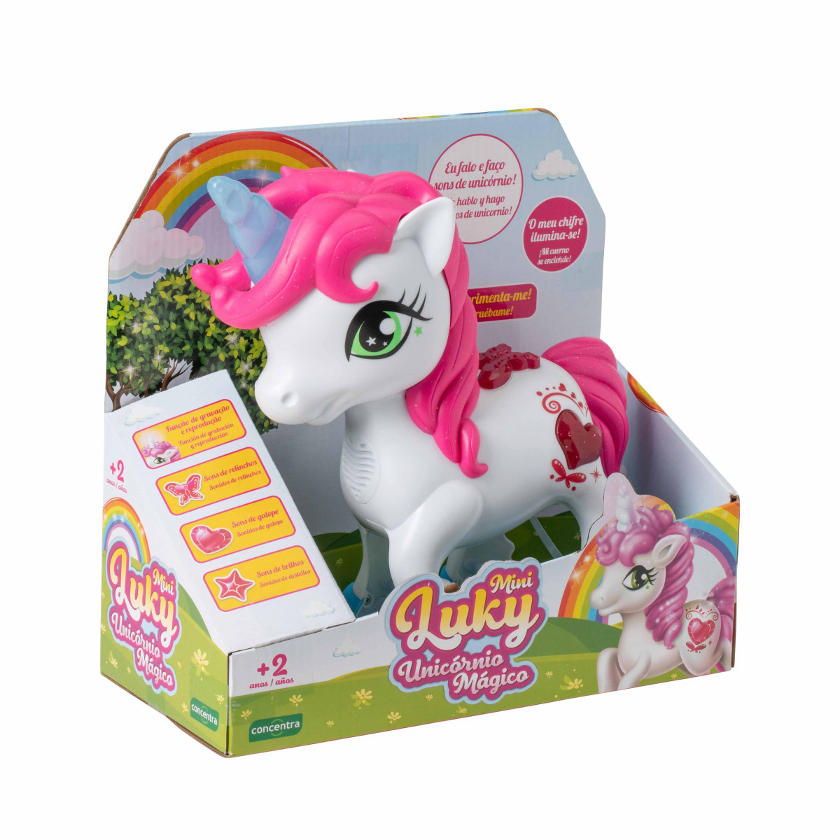 O mini Luky é um unicórnio colorido e muito brincalhão... Sempre que apertares o seu chifre, ele vai falar contigo e repetir o que disseres!
