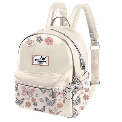 Mochila da Minnie Mouse para passear, com bolso exterior, na cor de marfim com apontamentos de flores e borboletas, com bolso exterior.