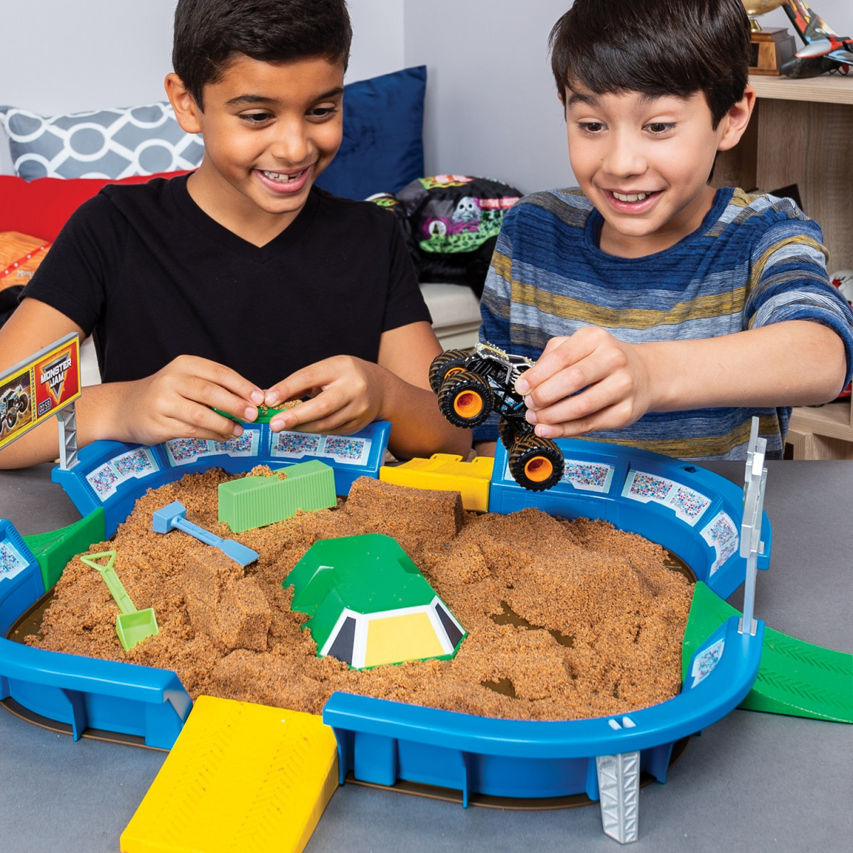 Conteúdo: 1 playset (arena), 1 carro exclusivo MaxD (maximum destruction), 907gramas de areia Monster Dirt, 4 rampas de entrada, 1 portão de entrada, 1 placard, 1 molde grande de rampa, 1 molde carro batido, 1 molde de contentor, 2 ferramentas para esculpir e 1 folha de adesivos.