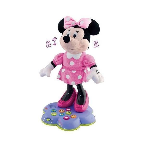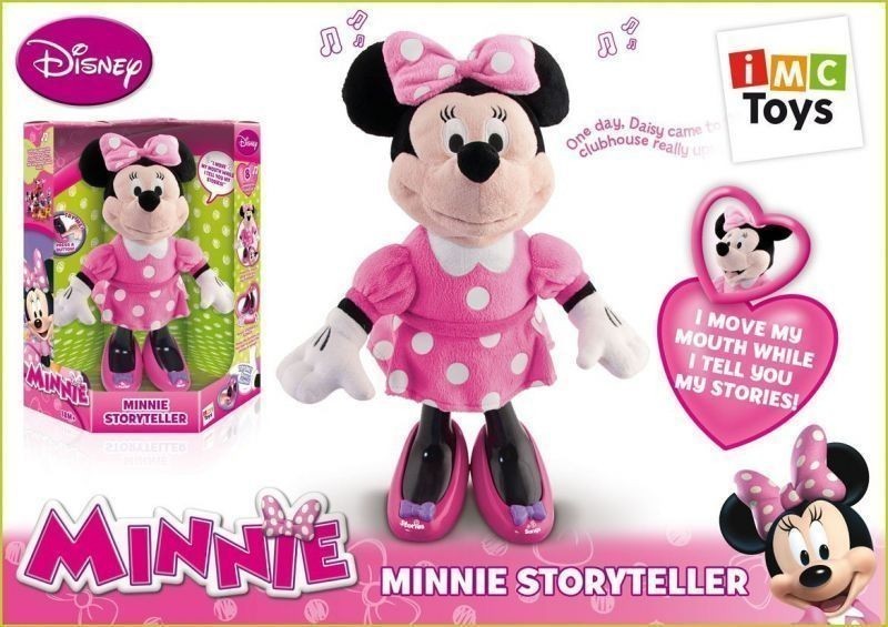 O peluche minnie move a boca enquanto conta as histórias e move os braços ao ritmo da música.
