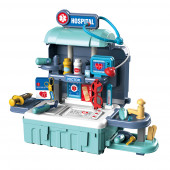 Inclui 38 acessórios: peças de encaixe variadas para montagem das bancadas distintas; autocolantes decorativos, estetoscópio, pensos, óculos, banca de limpeza, termómetro, martelo de sensibilidade, aparelhos de diagnóstico otorrino e outros acessórios de imitação.